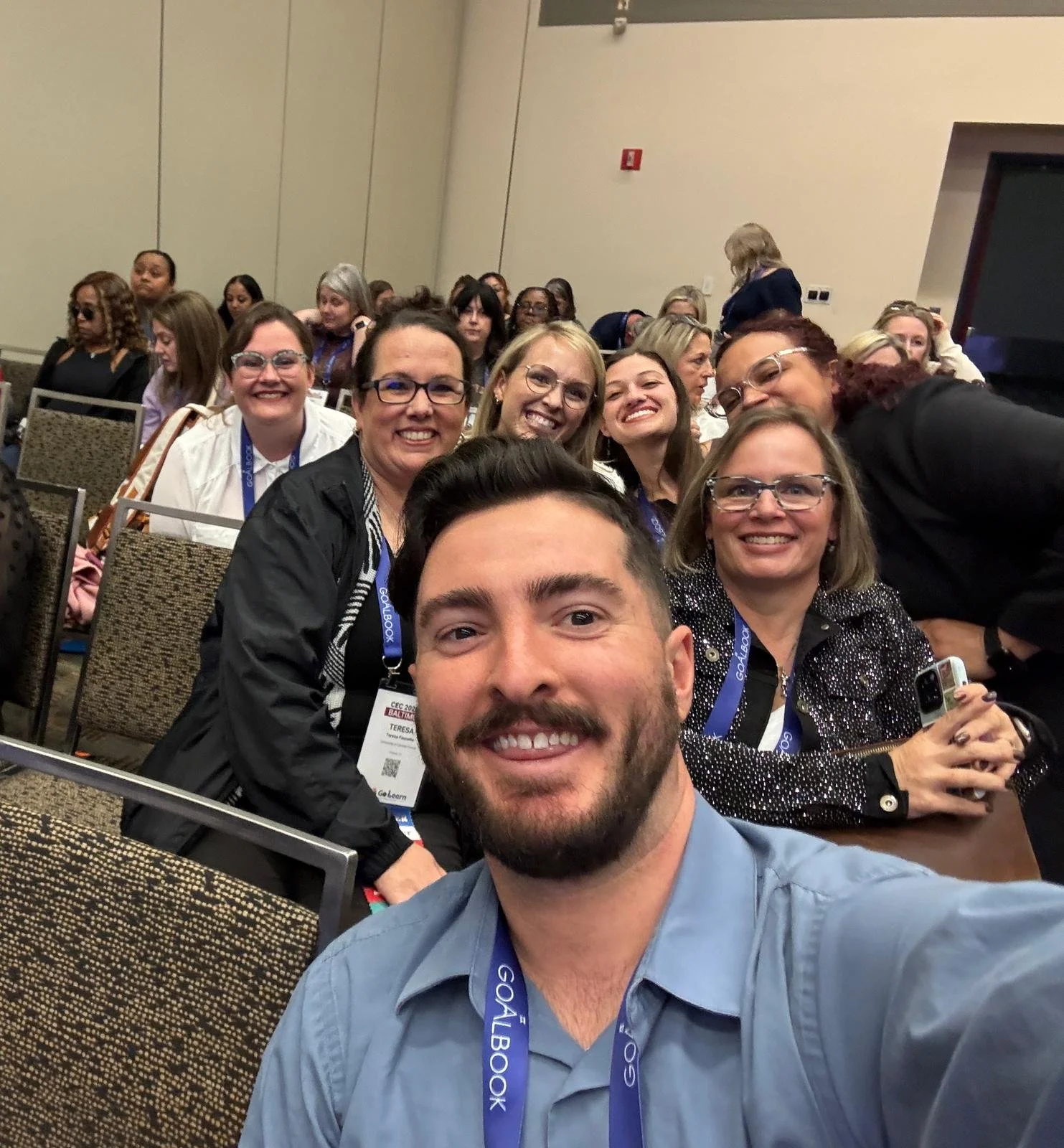 A group of smiling women and a man taking a selfie at a conference, wearing conference badges and lanyards, with some seated and some standing.