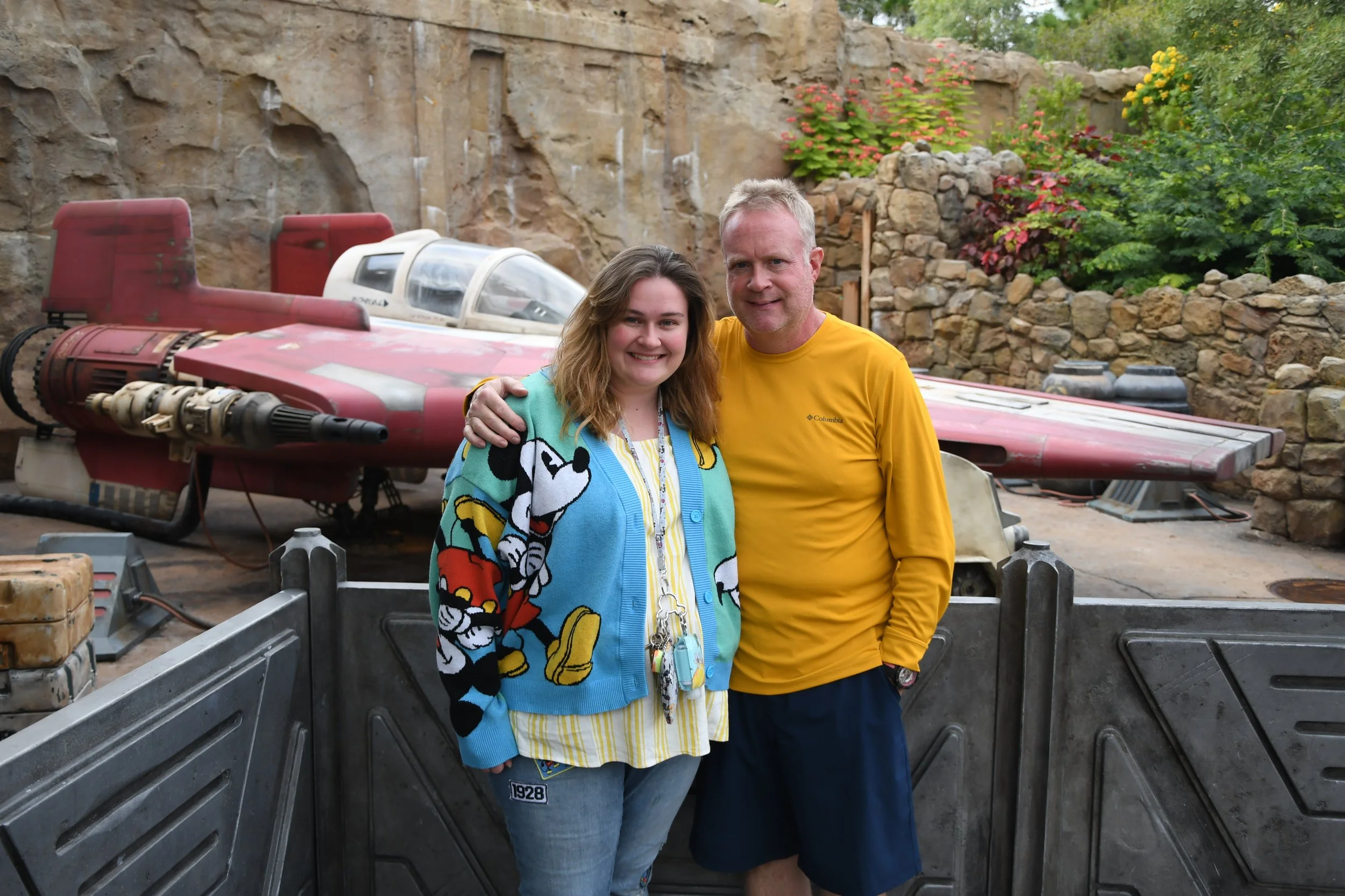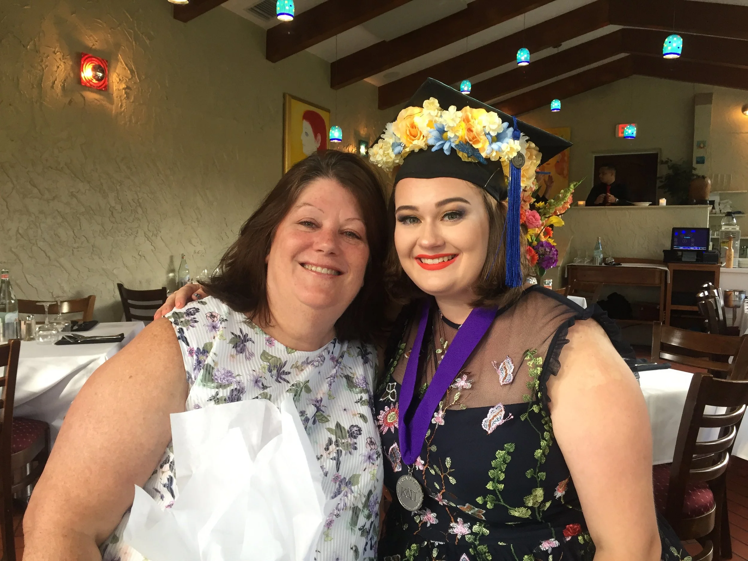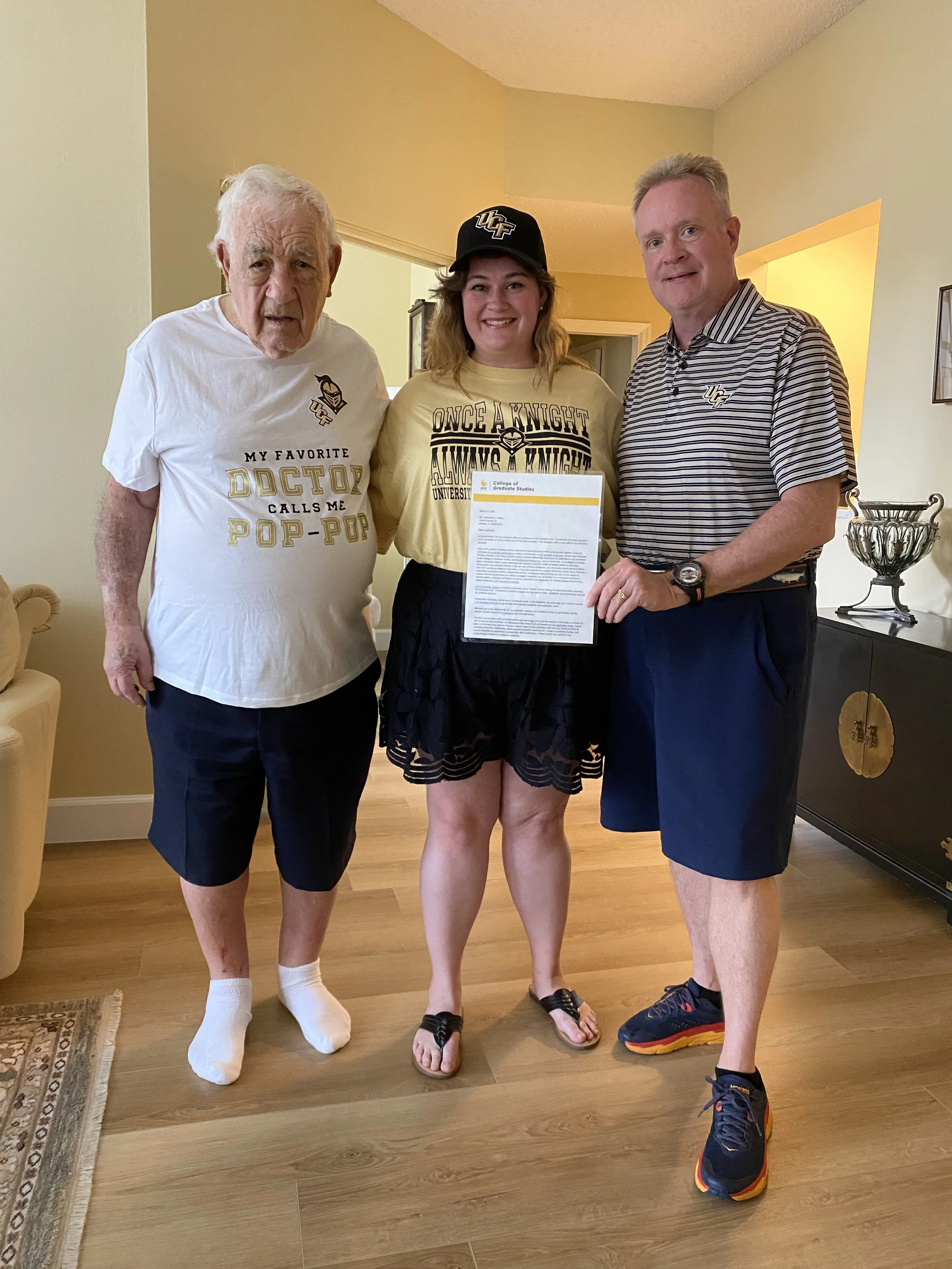 A young woman and an older man smiling and holding a college acceptance letter from UCF College of Graduate Studies.