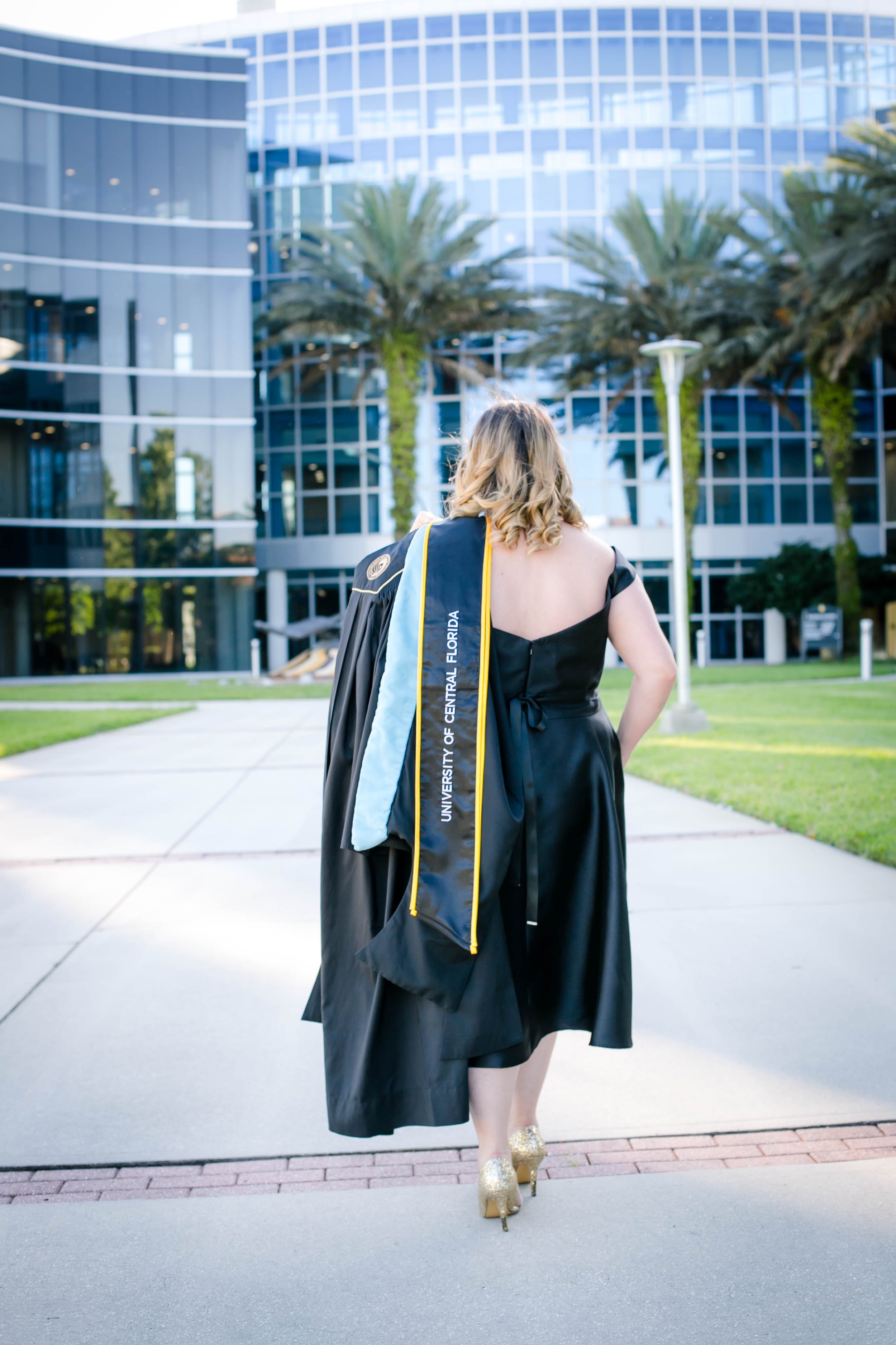 Graduate in a black dress and glittery heels walking away with a graduation gown and stole outside a modern glass building with palm trees.