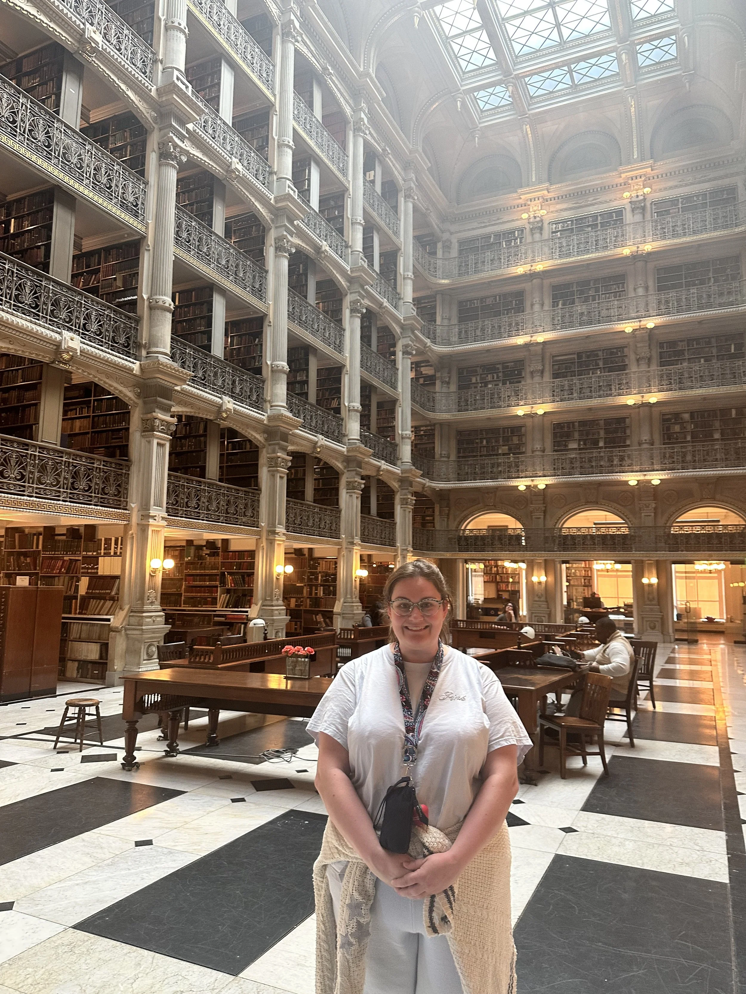 A woman smiling and standing inside a grand, multi-story library with ornate iron balconies and large windows, illuminated by natural and artificial light.