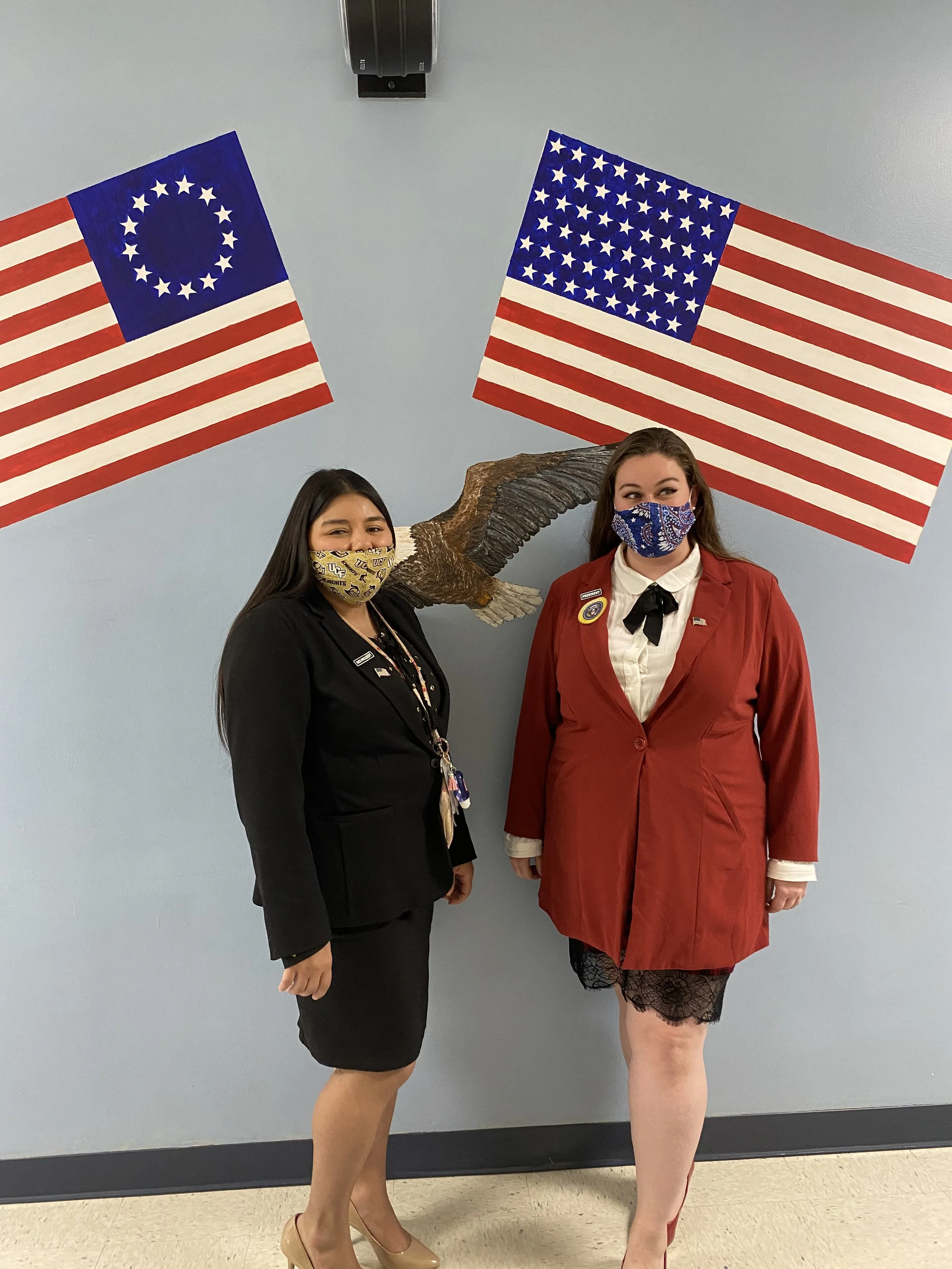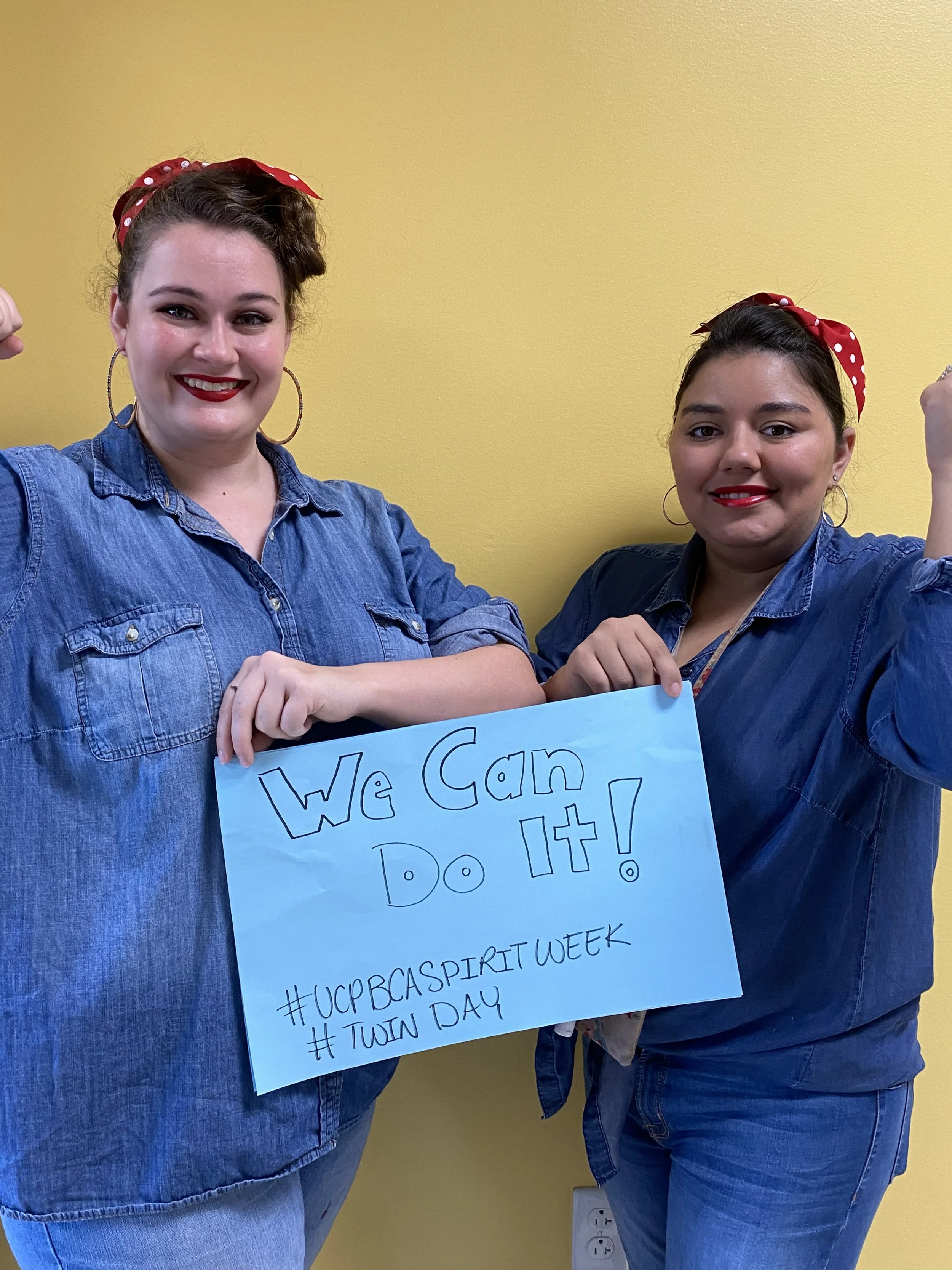Two women wearing denim shirts and red polka dot headbands, holding a blue sign that reads "We Can Do It!" with hashtags #UCPBCASpiritWeek and #TWIN Day, standing against a yellow wall, showing enthusiasm and empowerment.