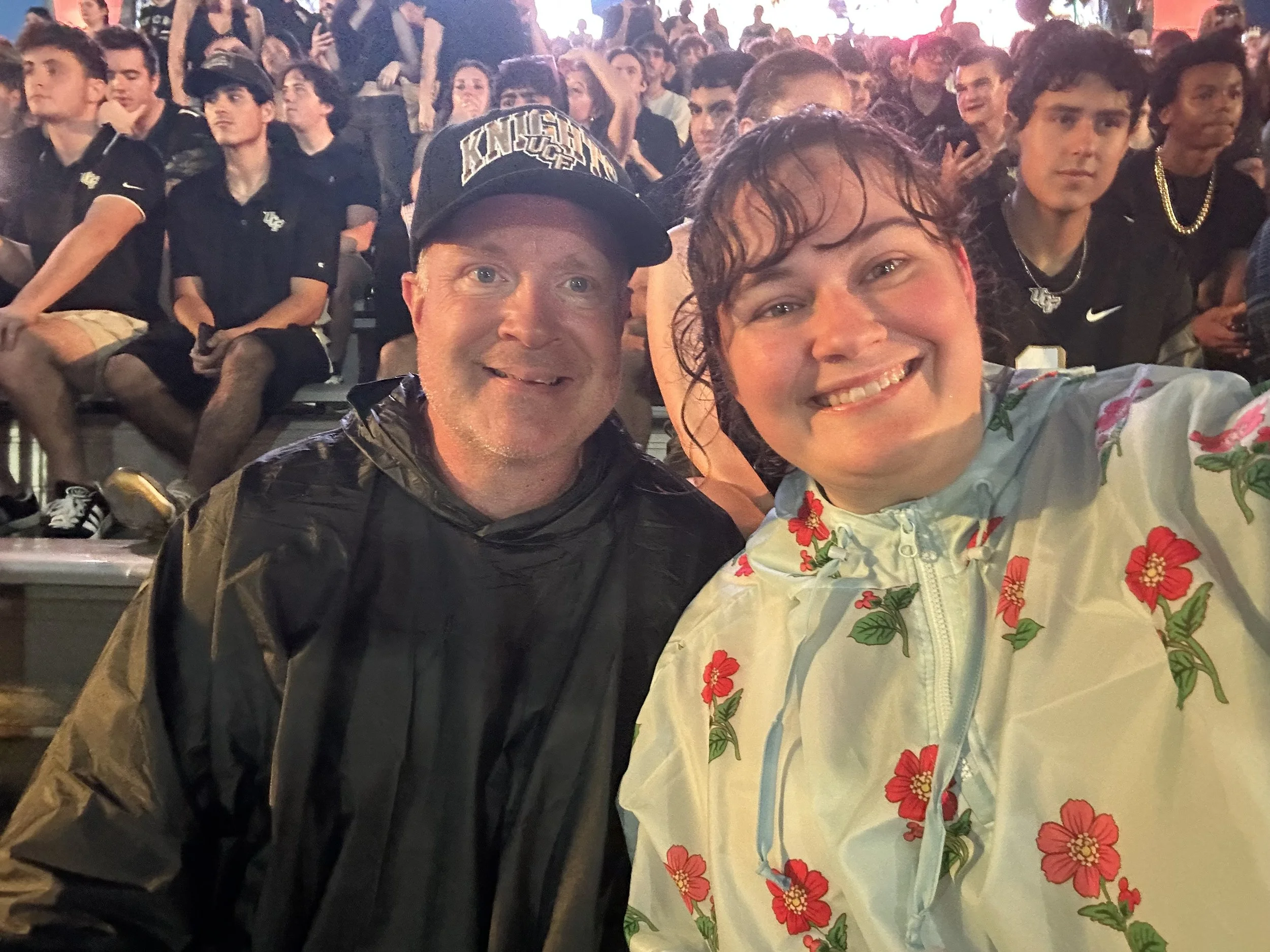 A man and woman smiling, holding a letter from the College of Graduate Studies, with the man wearing a University of Central Florida Knights T-shirt and cap.