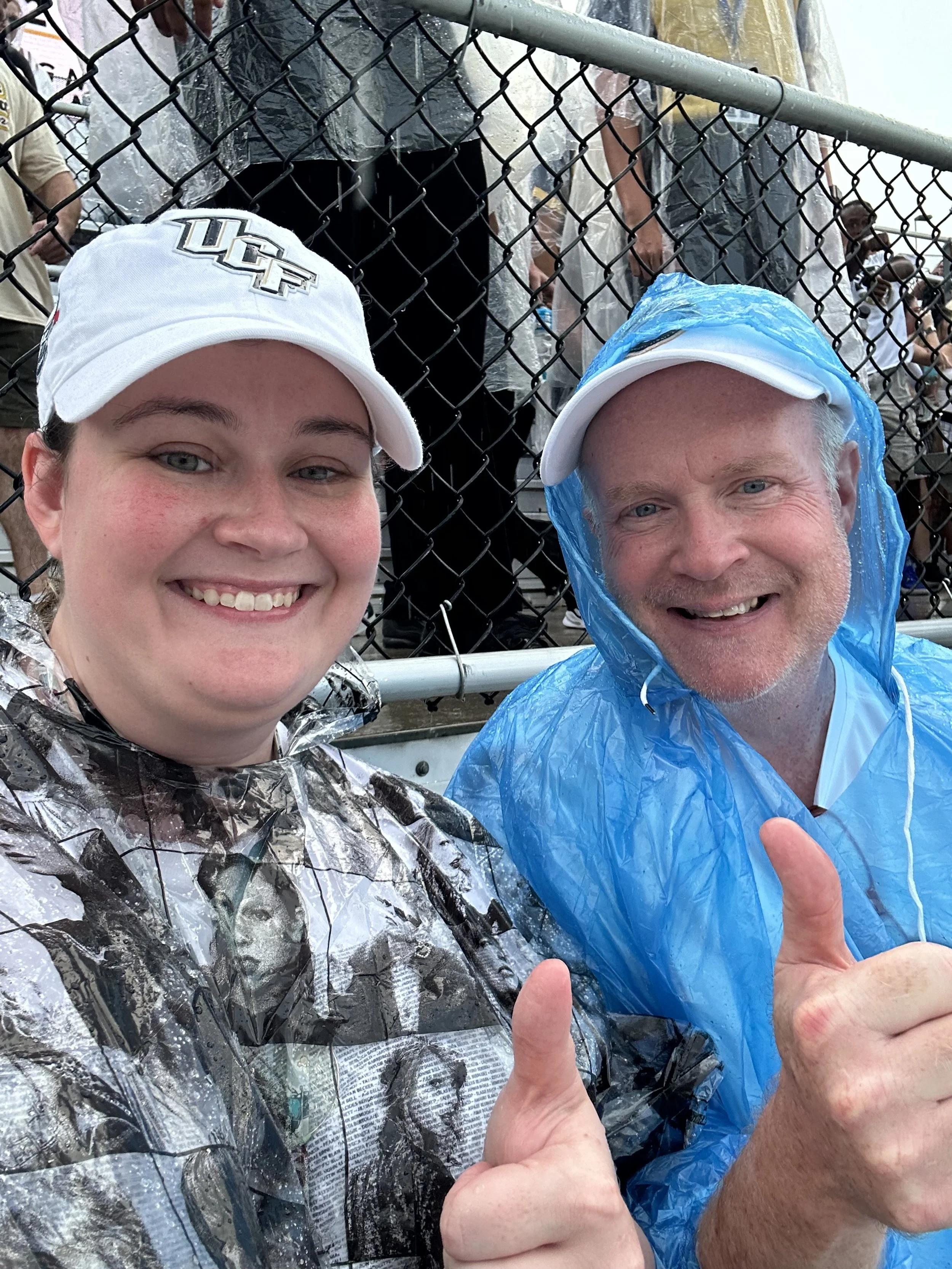 Two people smiling at a sports event, wearing rain ponchos and caps, showing thumbs up in front of a chain-link fence with spectators and photographers in the background.