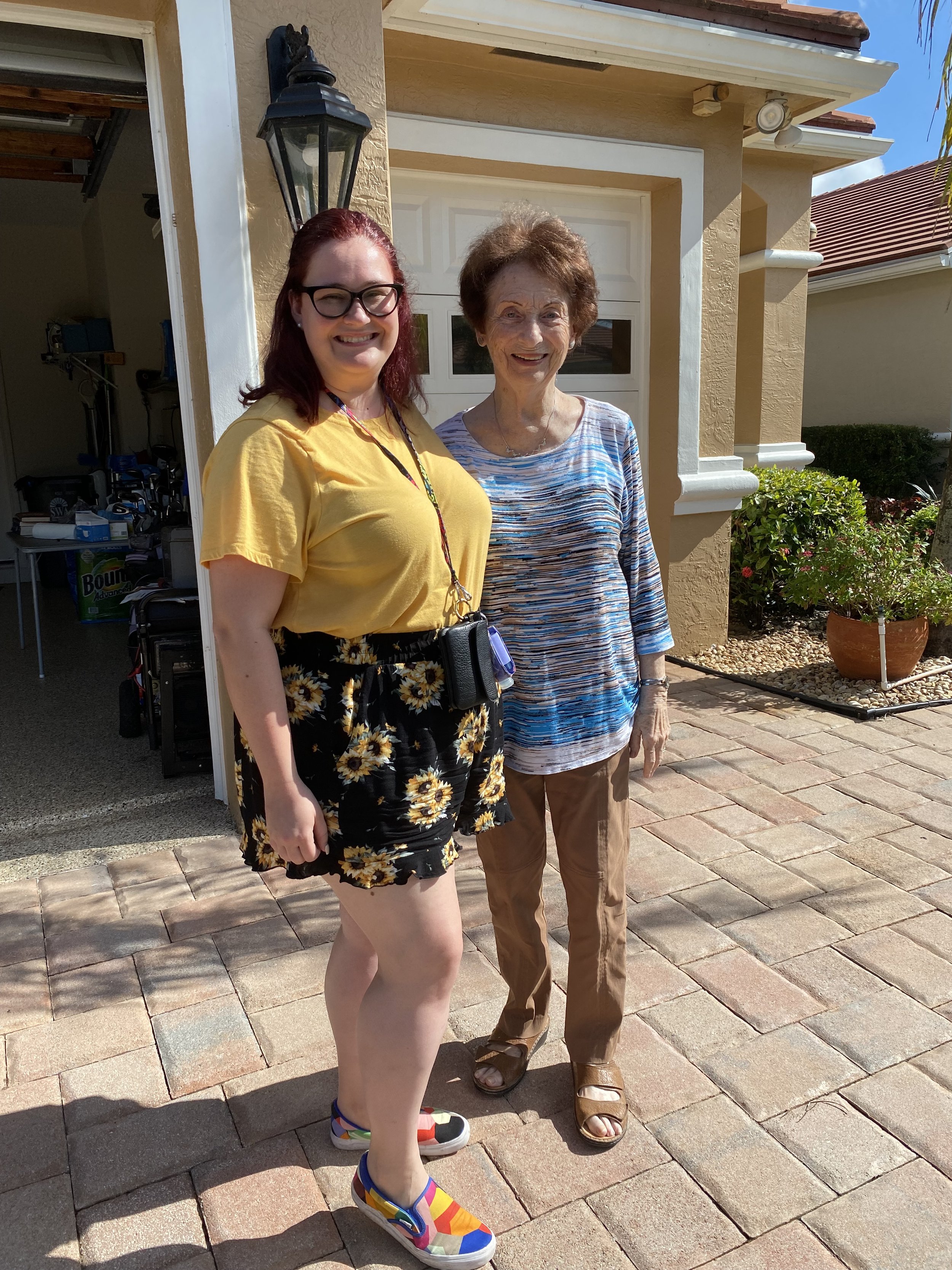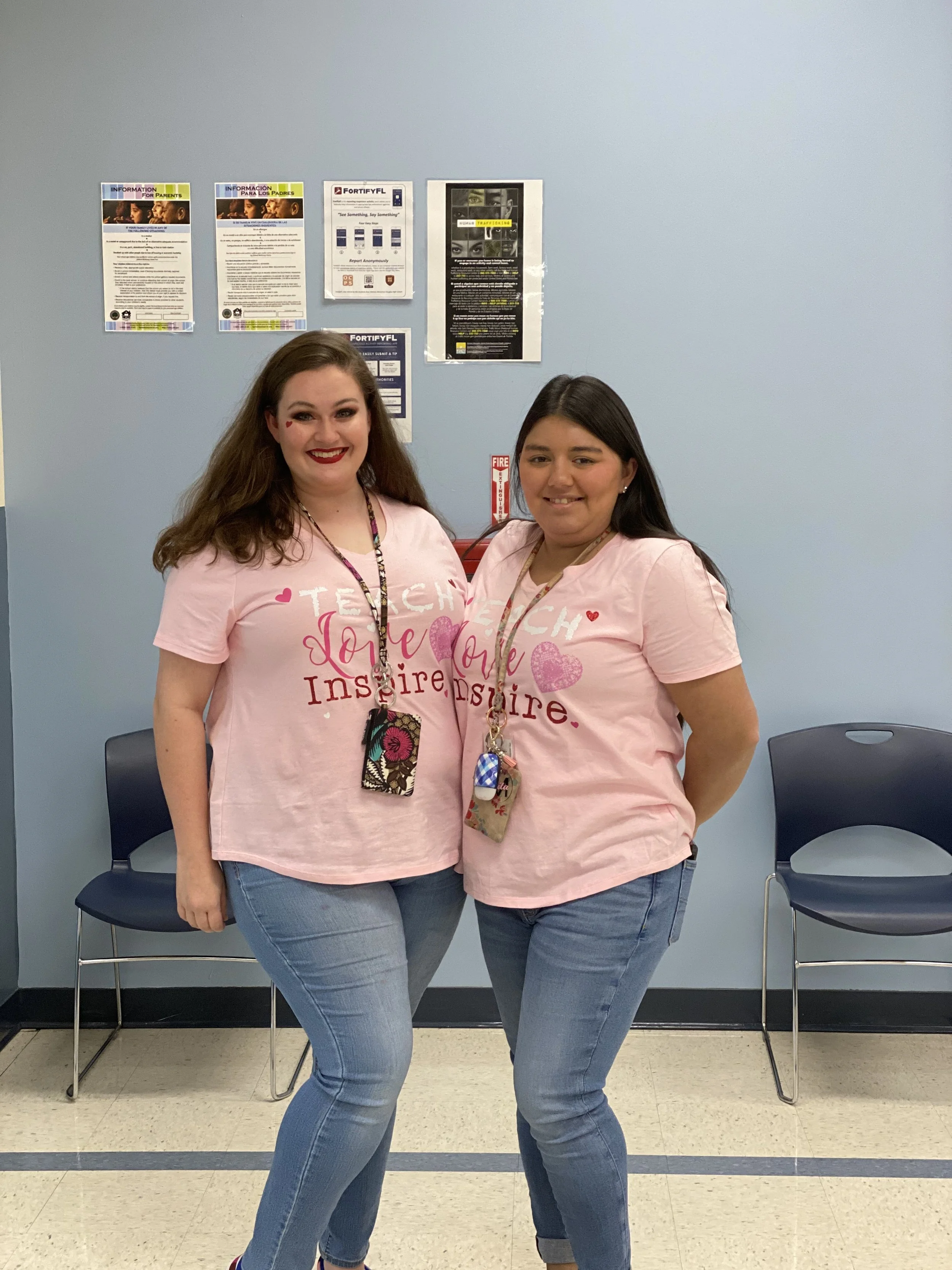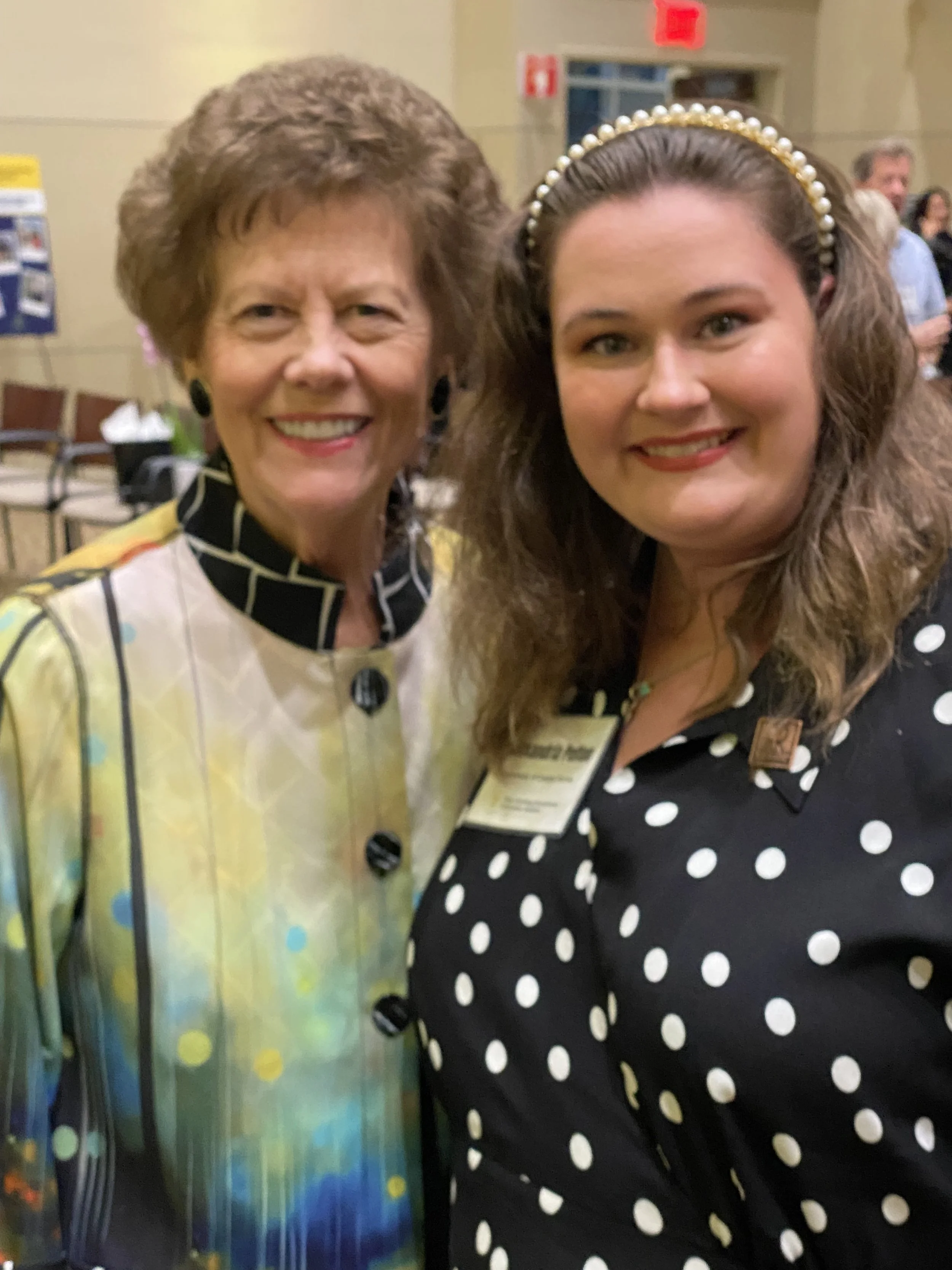 Two women smiling and holding name badges at a conference. The woman on the left has blonde hair, wears a floral top, and has a badge that reads Rachel Barker, Winter Springs, FL. The woman on the right has brown hair, wears a light pink blouse with