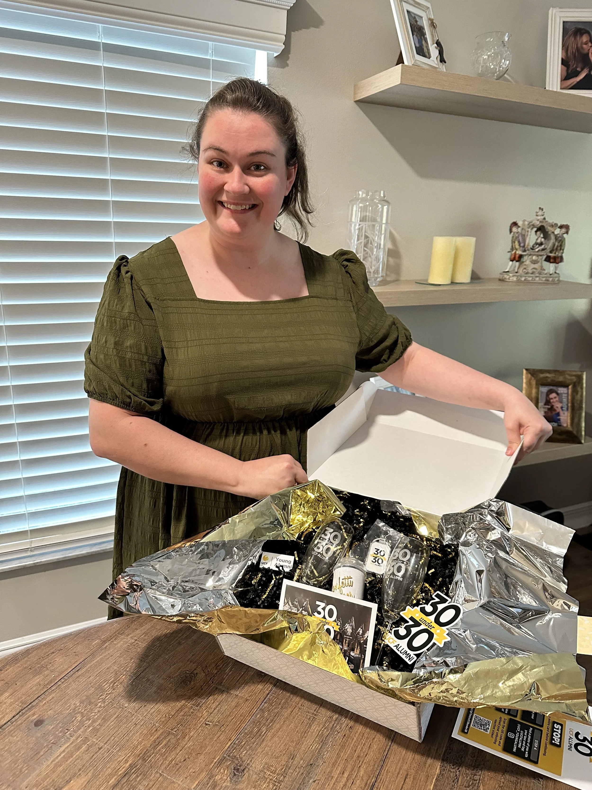 A woman opening a box with black and gold decorations, champagne bottles, and congratulatory cards, celebrating a 30th birthday.