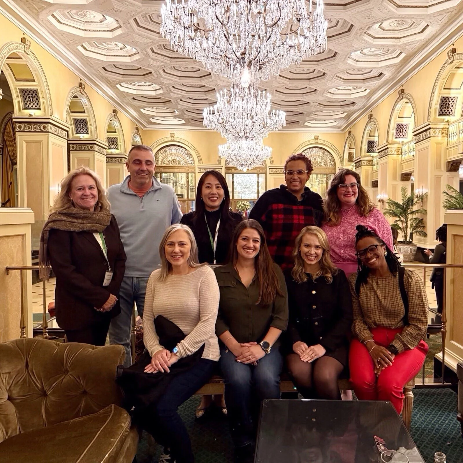 Group of nine women and one man posing together in an elegant, well-lit lobby with chandeliers, large windows, and ornate decor.