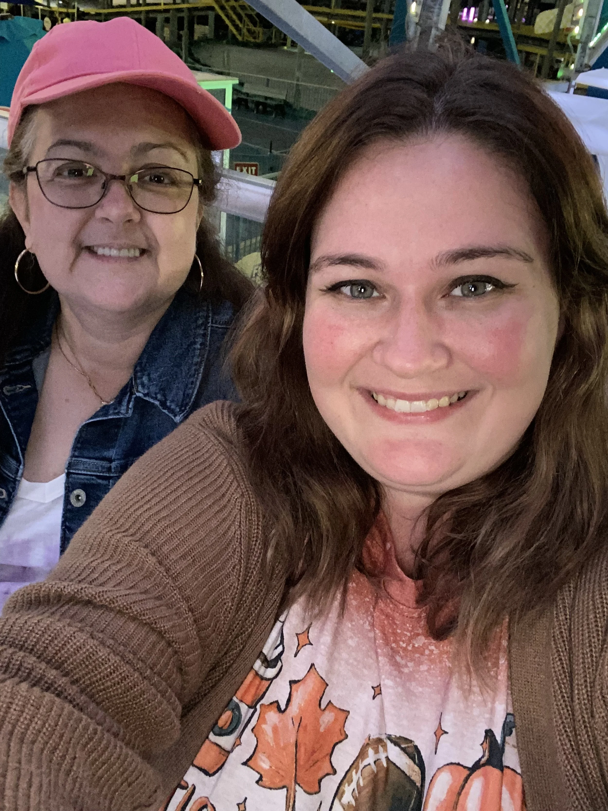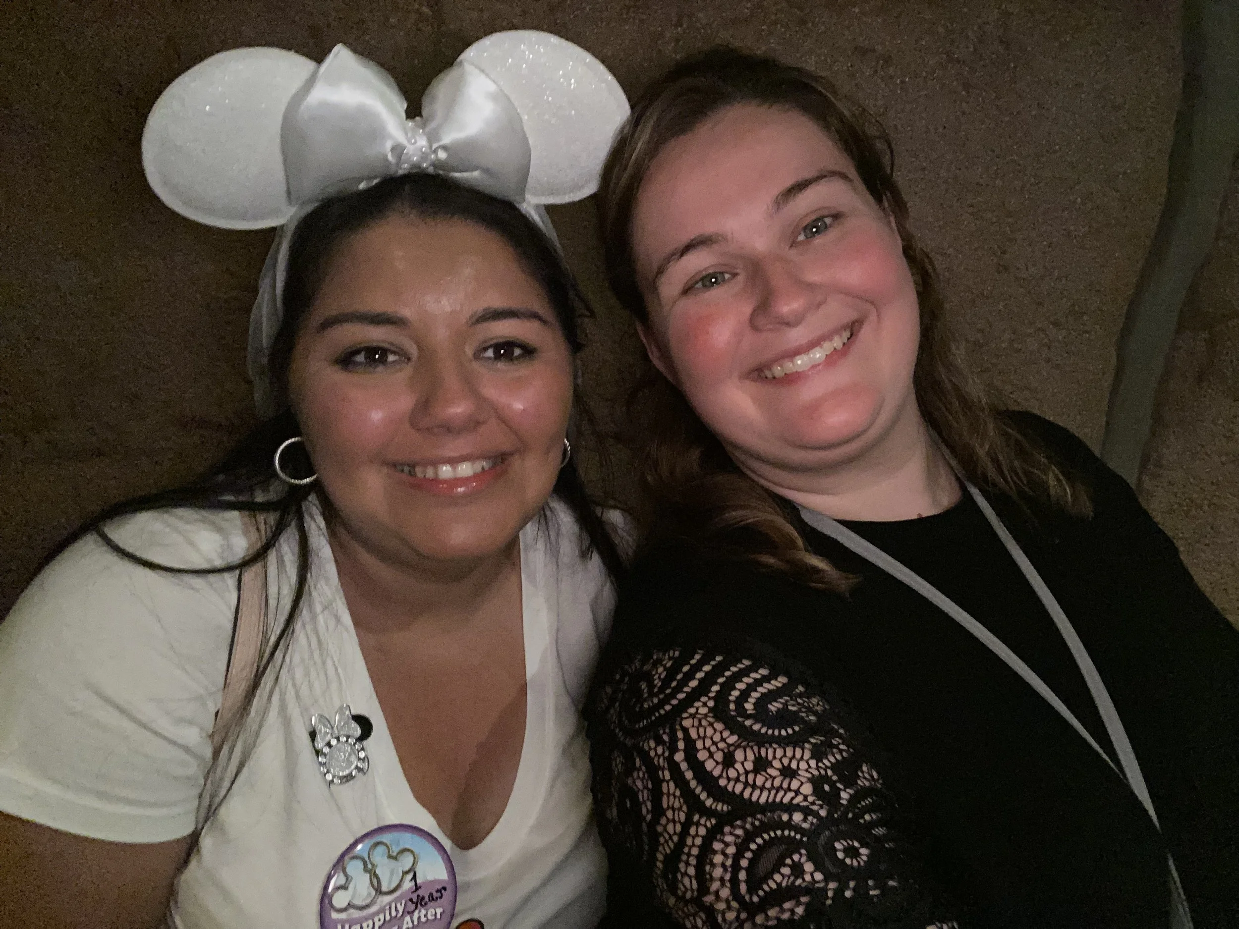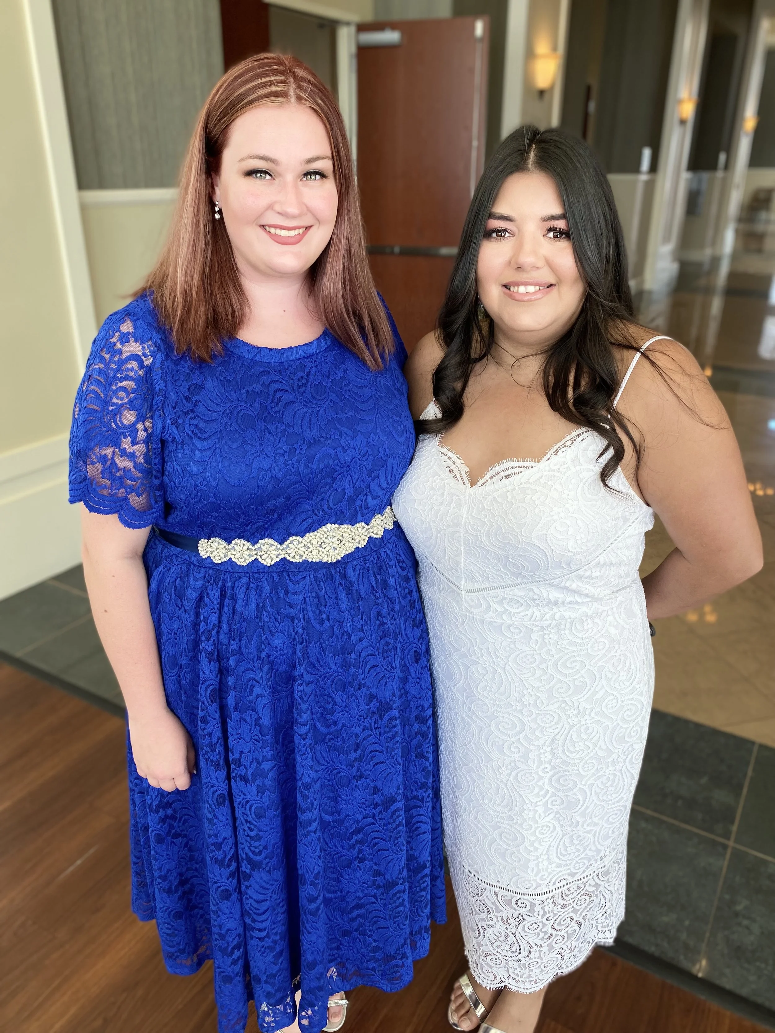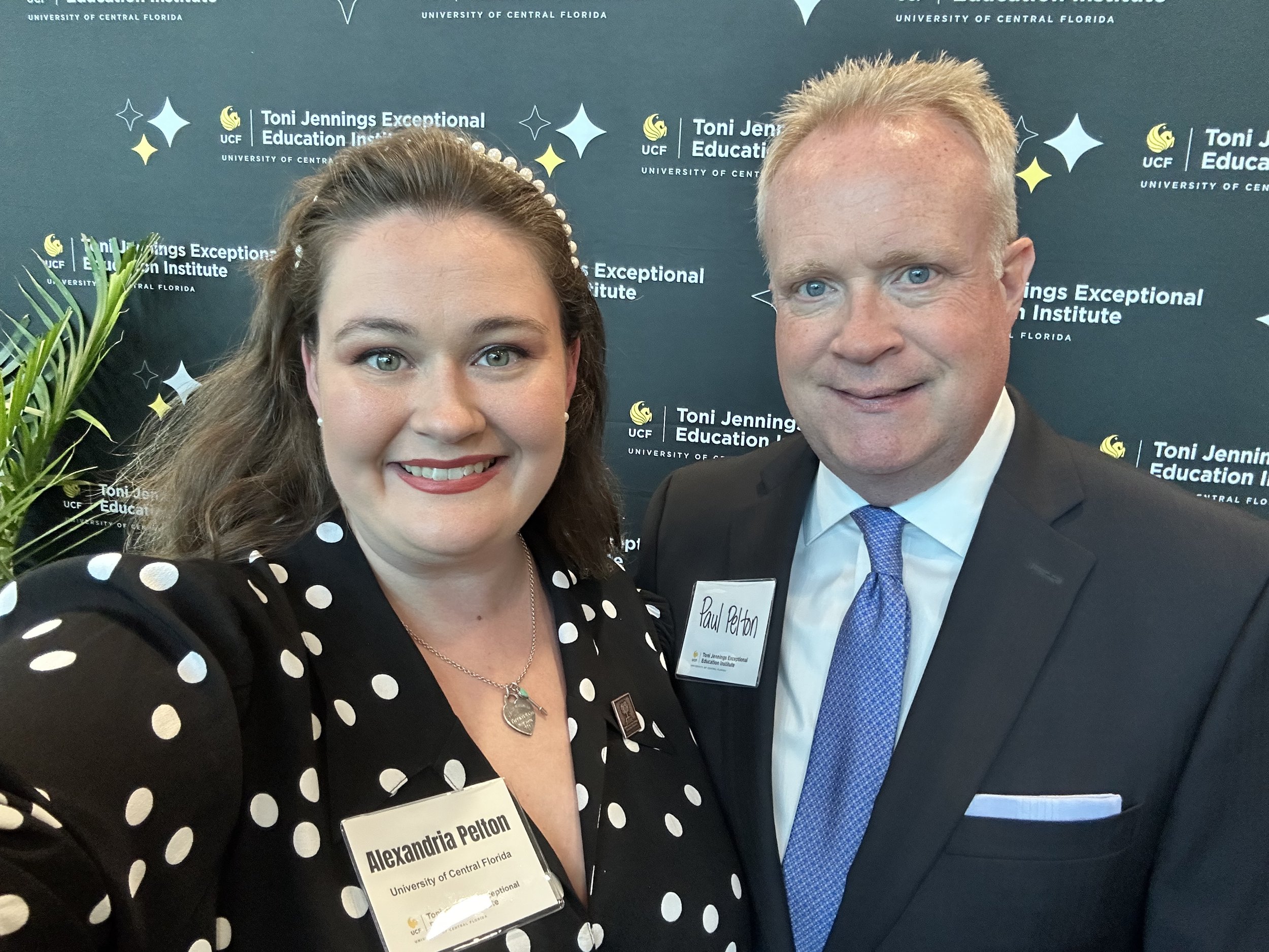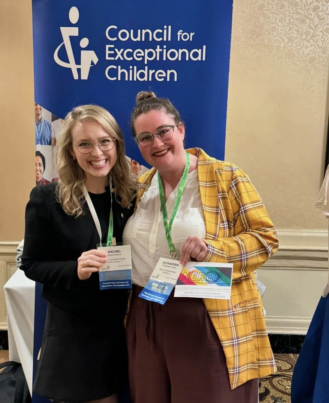 Two women smiling at an event, standing in front of a blue banner with the logo and the words 'Council for Exceptional Children'. One woman holds a name badge for Rachel Baker and the other for Alexandria. Both are wearing conference lanyards and bad
