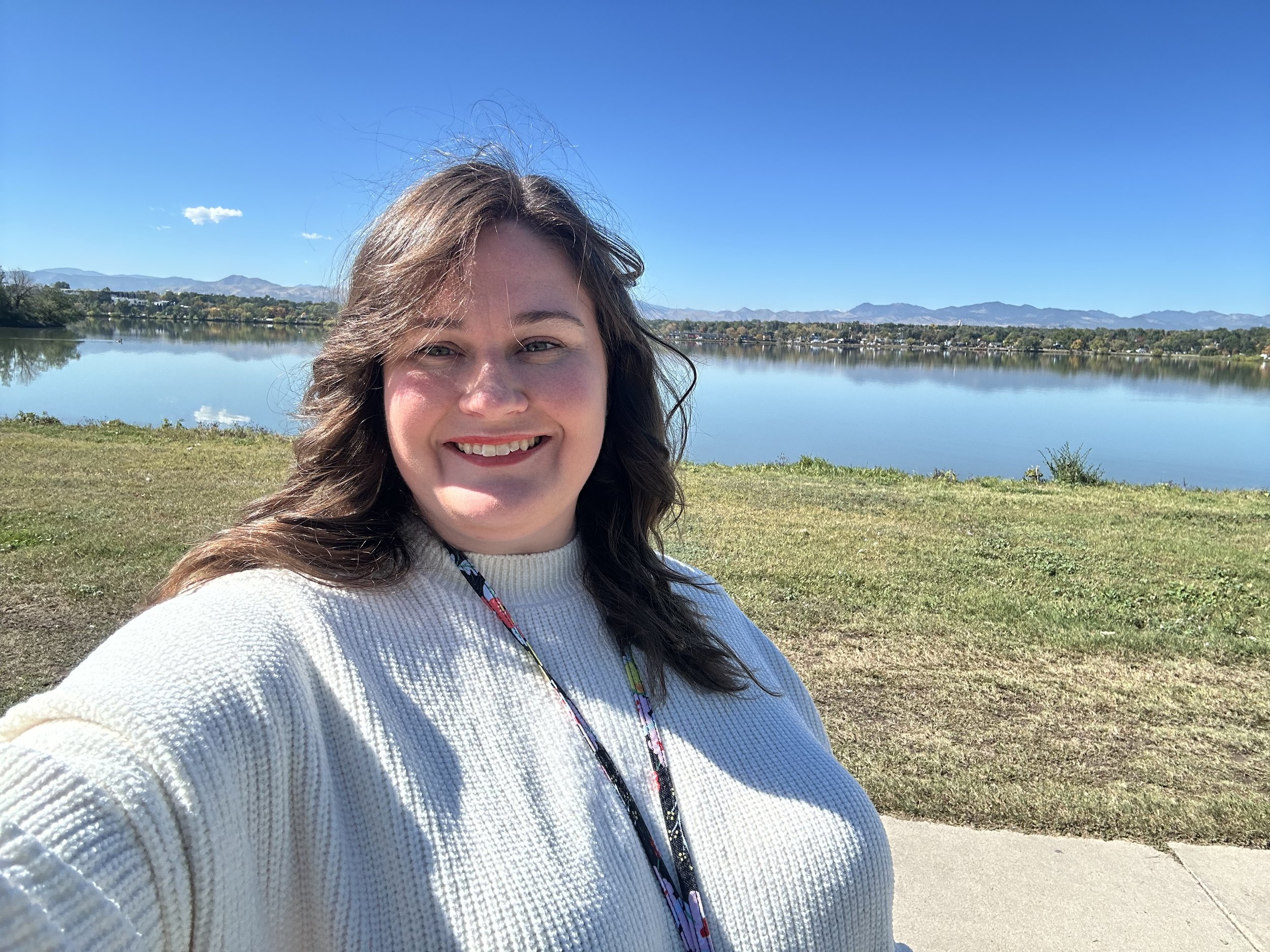 A woman taking a selfie outdoors with a lake, green grass, trees, mountains, and a clear blue sky in the background.