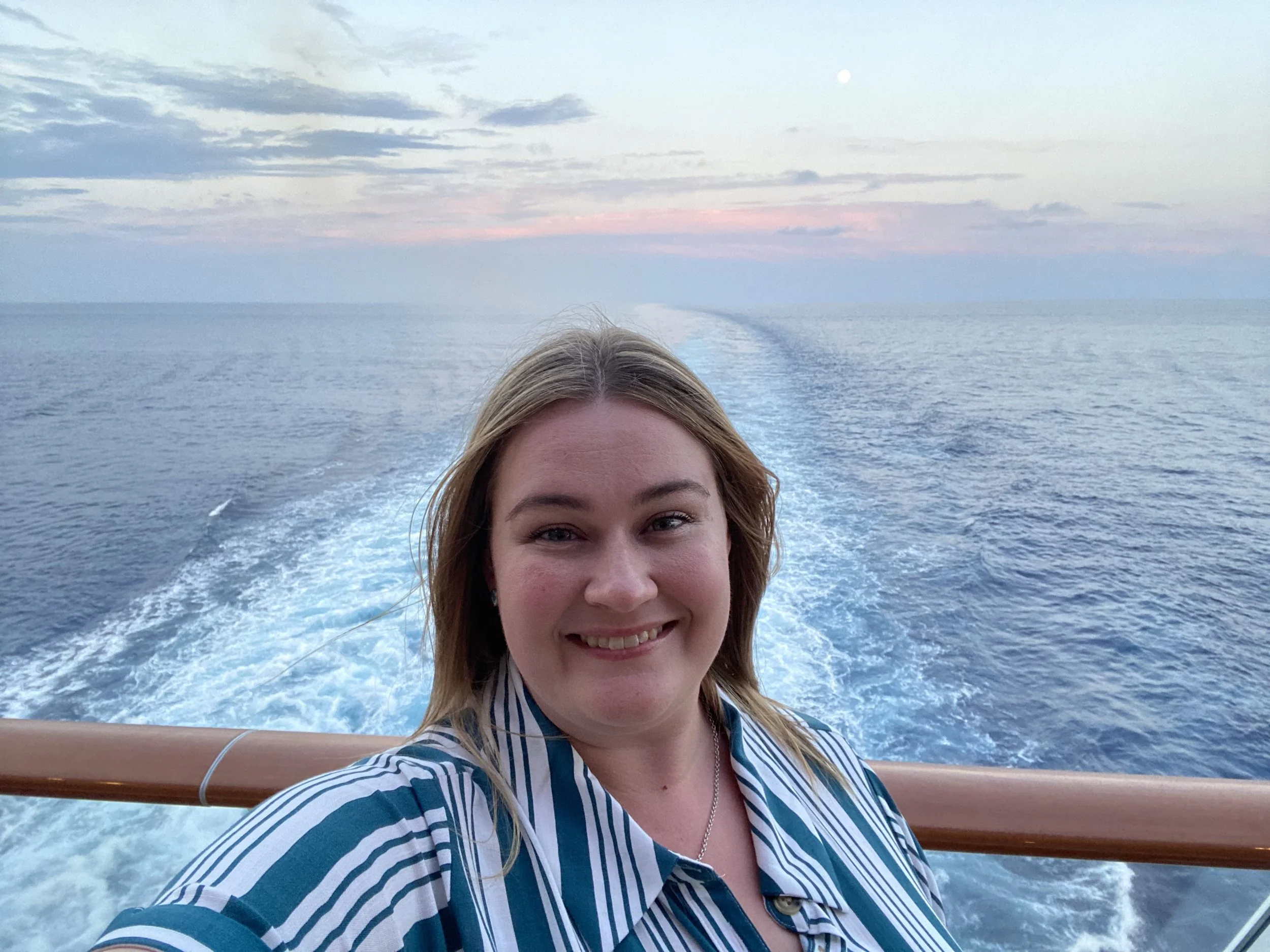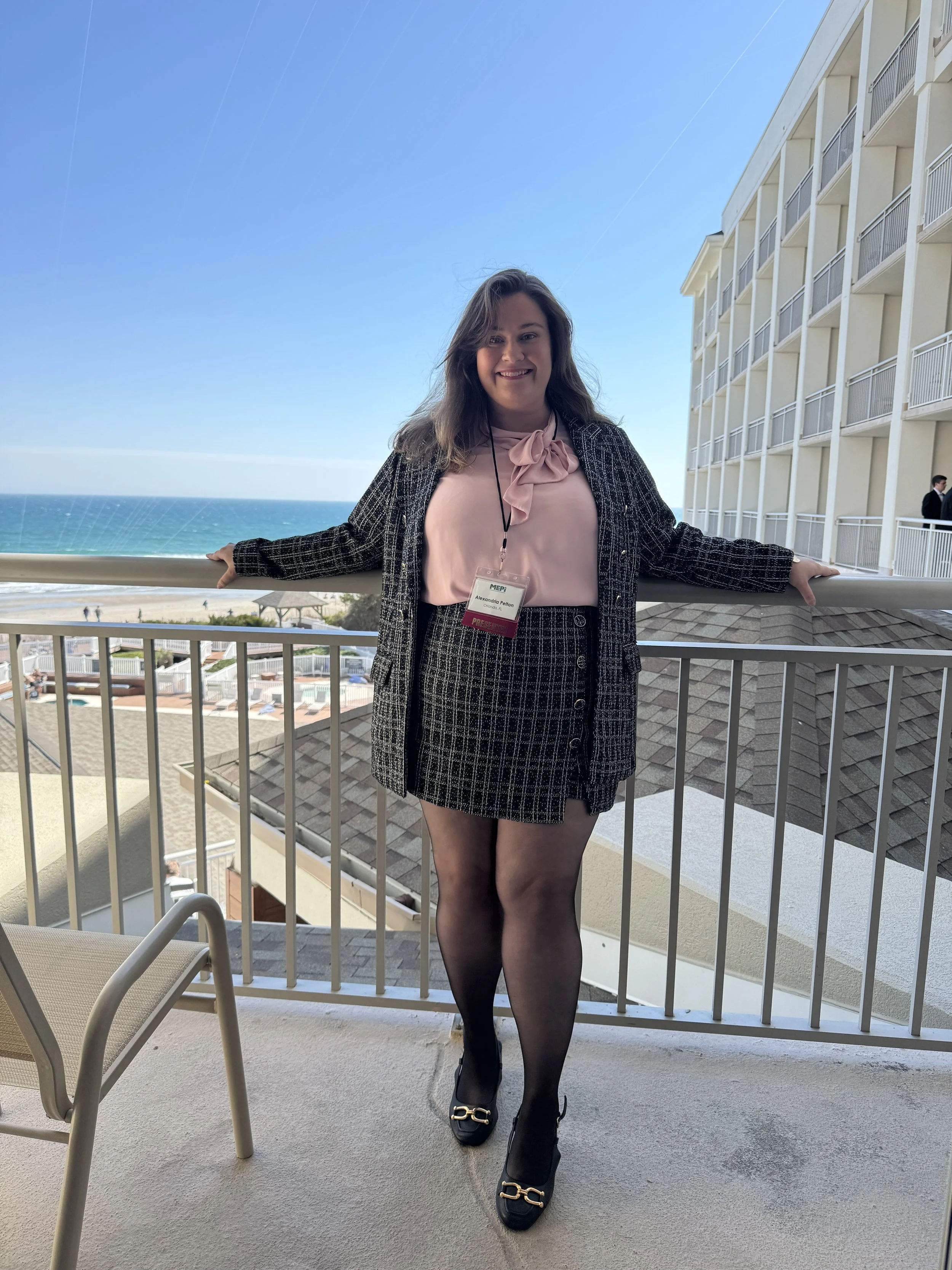 Woman standing on balcony overlooking beach and ocean, wearing a patterned blazer and skirt, pink blouse with bow, black tights, and black heels, smiling at camera.