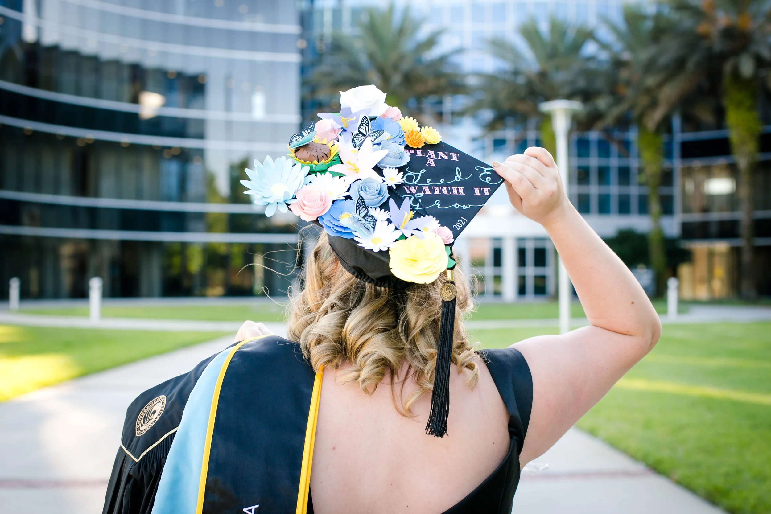 Graduate with blonde curly hair wearing a cap decorated with colorful paper flowers and butterflies, holding it up in front of a modern glass building and green lawn.