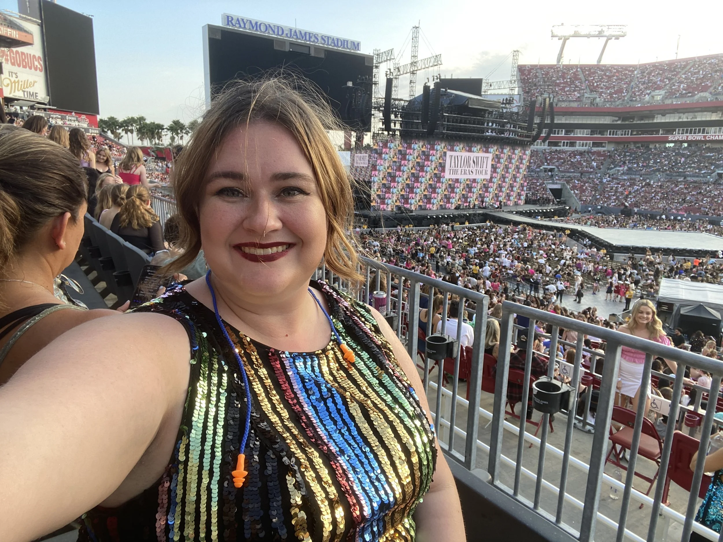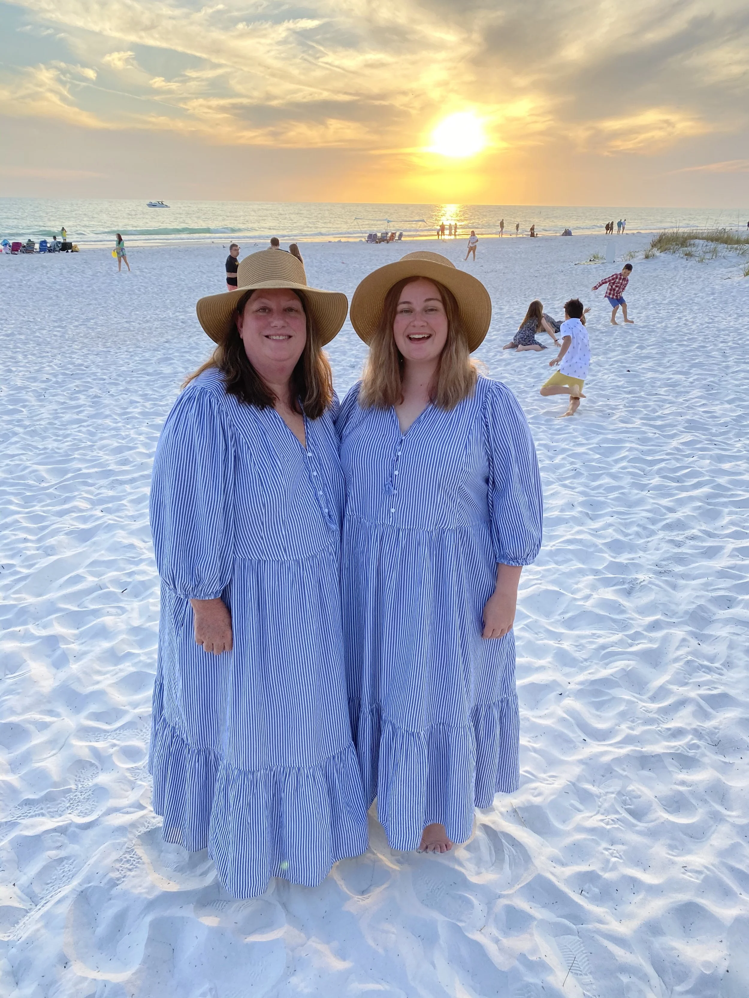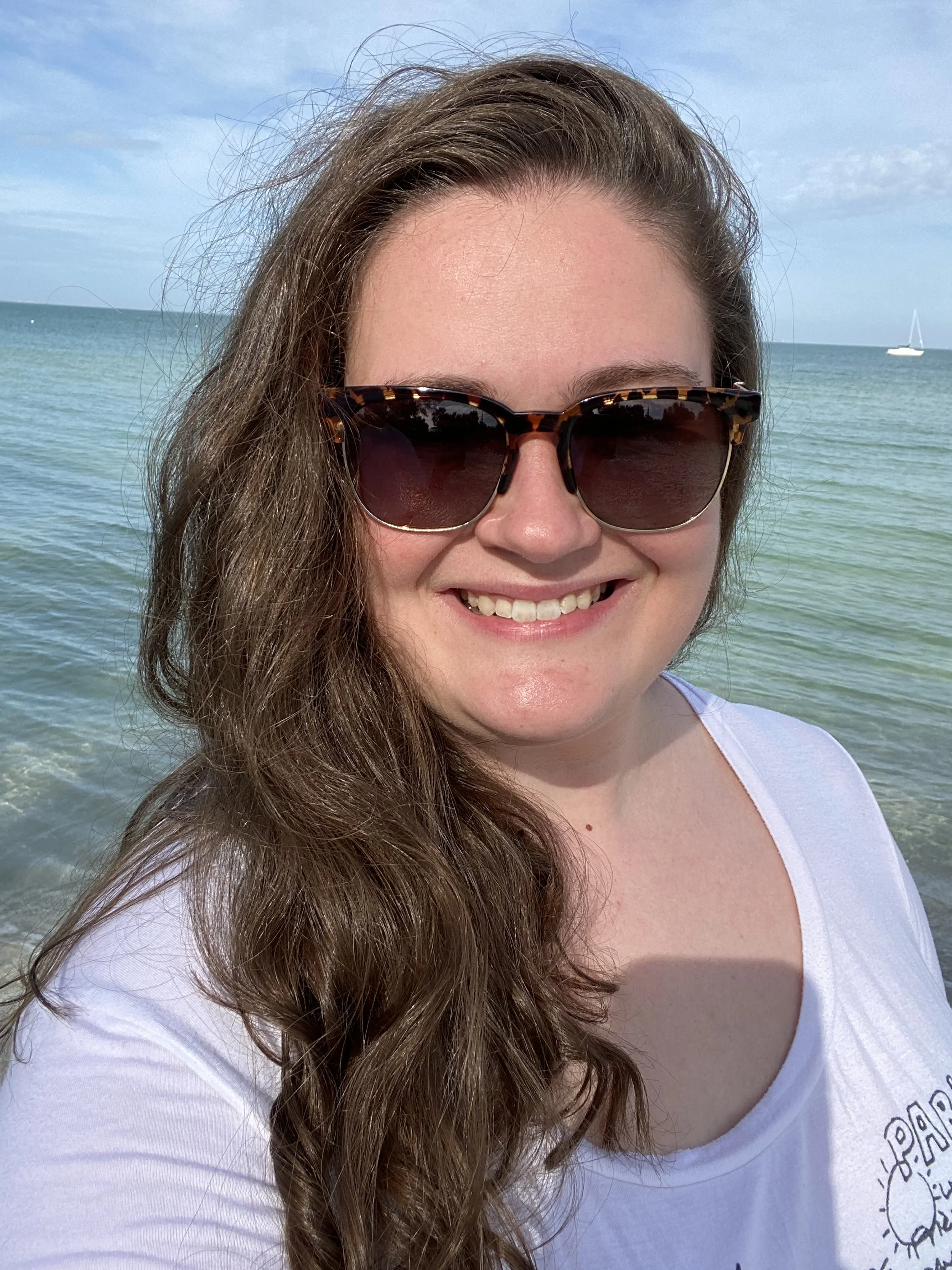 A woman taking a selfie in front of a sunset beach mural, wearing glasses with a floral pattern and a black and white polka dot top.