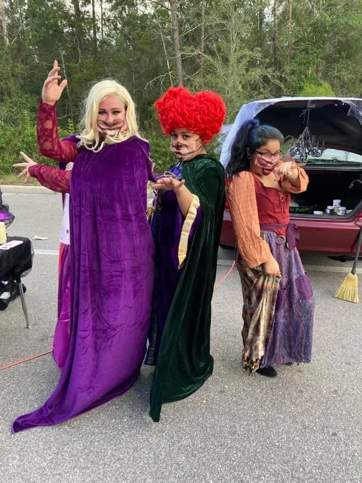 Three children dressed in Halloween costumes standing outdoors near a car with an open trunk, decorated for Halloween. The first child is wearing a purple cape and dress, the second in a green velvet cape with a red wig and face makeup, and the third