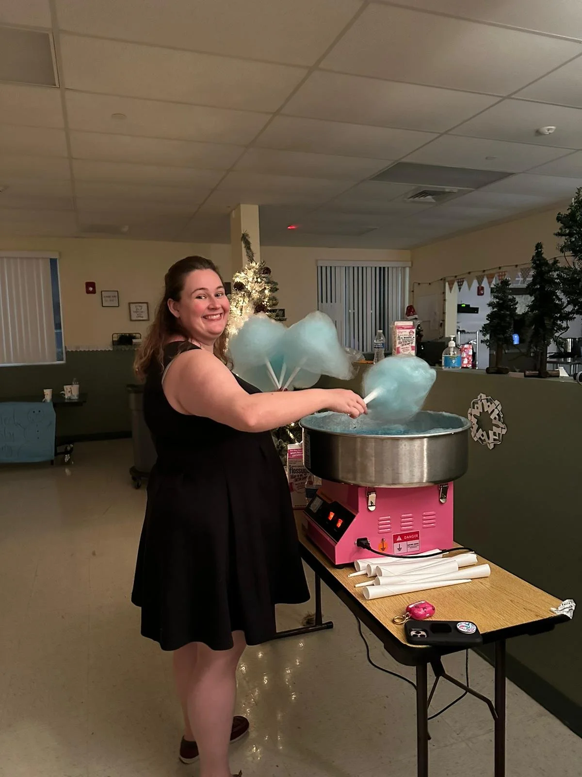 Woman smiling and making cotton candy at a cotton candy machine in a decorated room.