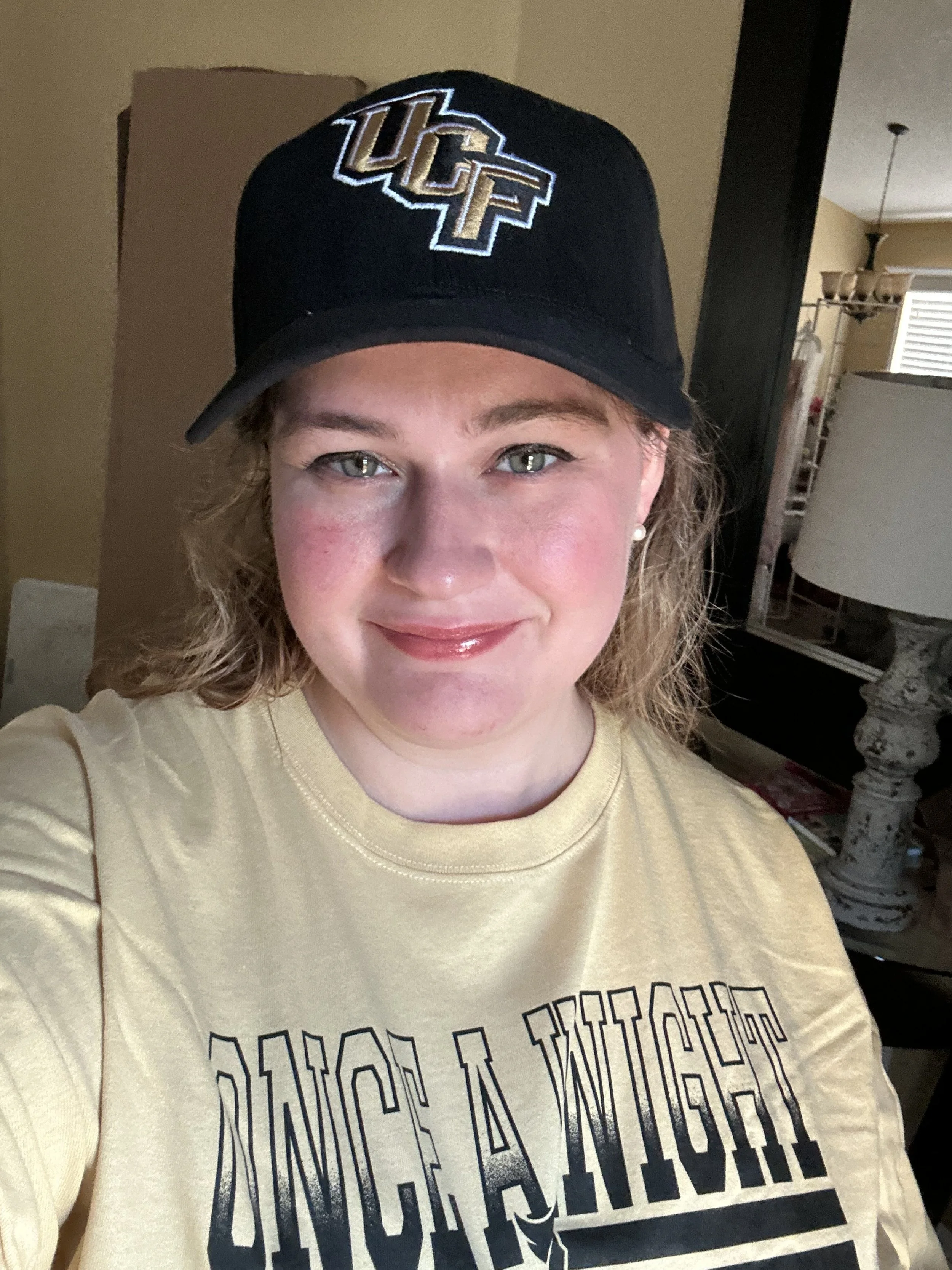 A young woman wearing a black UCFC baseball cap and a yellow T-shirt with bold text, smiling inside a room with beige walls and a mirror in the background.