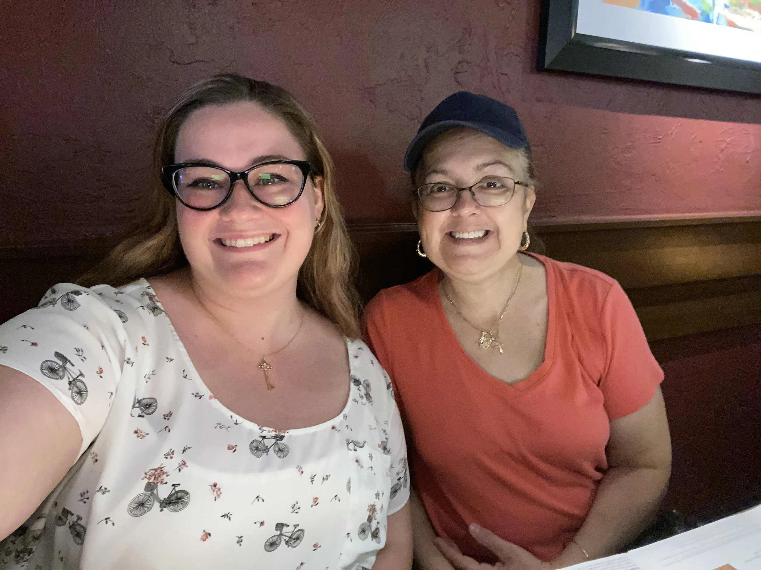 Two smiling women taking a selfie outdoors in an urban setting with trees, cars, and buildings in the background.