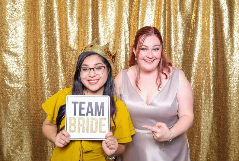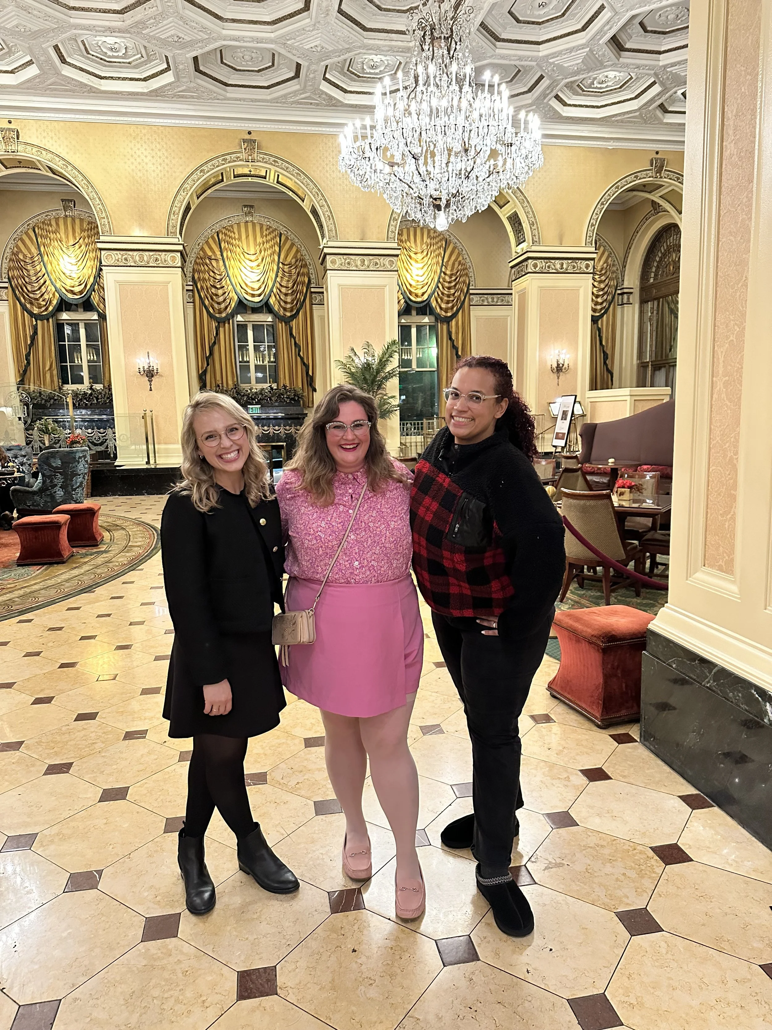 Three women smiling and posing together inside a luxurious hotel lobby with ornate gold drapes, high ceilings, a large chandelier, and elegant decor.