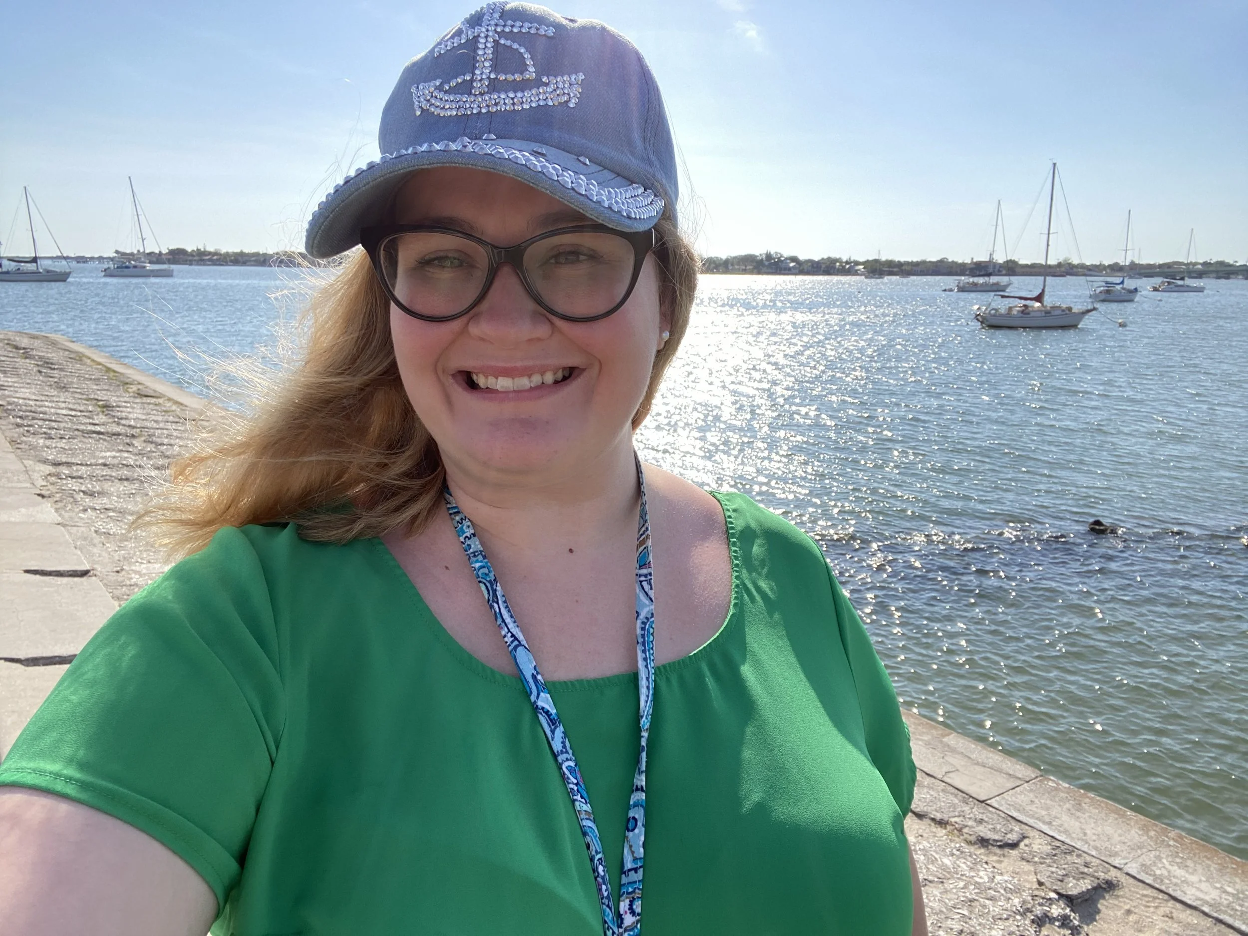 A woman with shoulder-length brown hair smiling for a selfie indoors, wearing a cream-colored sweater and a colorful lanyard, with plants and a glass door in the background.